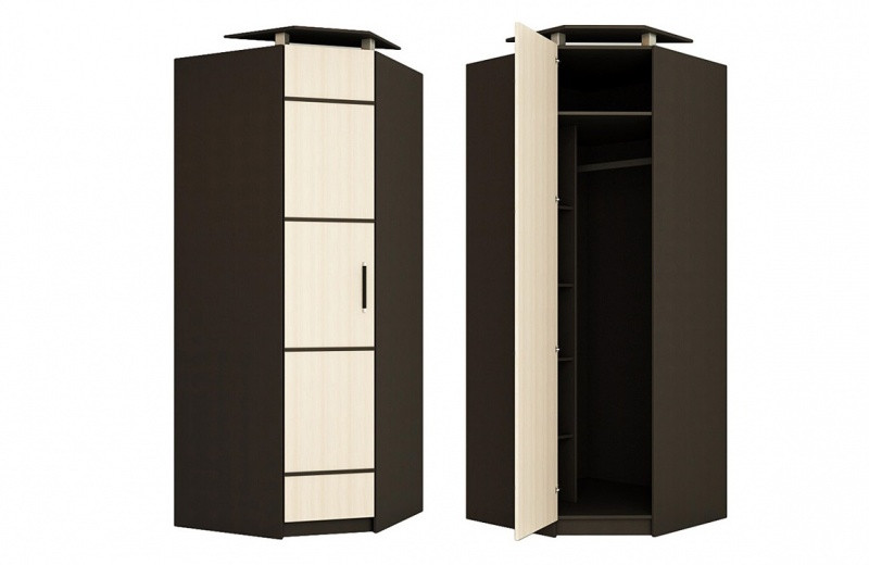 Особенности шкафа: Шкаф предназначенный для организации плавного перехода на углах комнаты из одной плоскости гарнитура в другую. Внутри шкаф имеет три отделения. Слева расположено отделение с четырьмя полками. Сверху полка для мелких вещей или головных уборов. И справа отделение со штангой для вешалок.